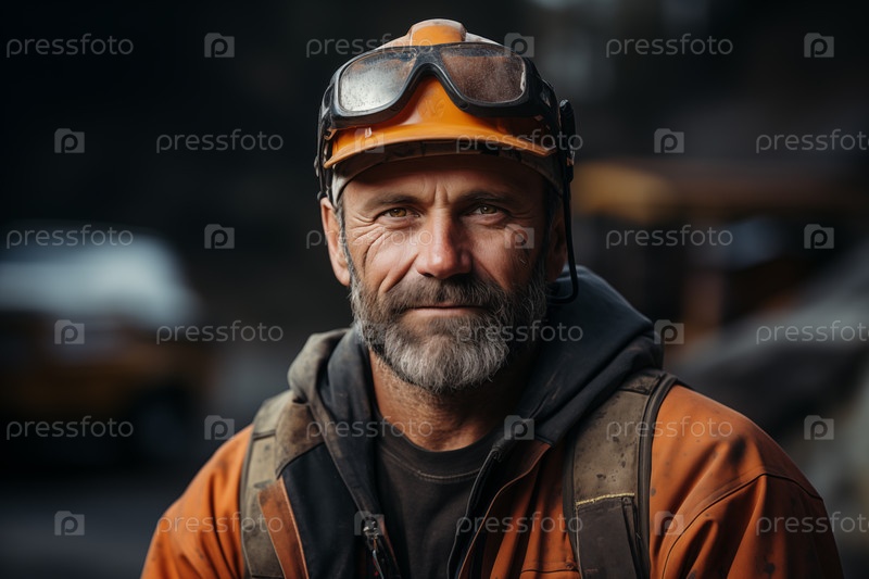 Портрет рабочего мужчины в каске на размытом промышленном фоне