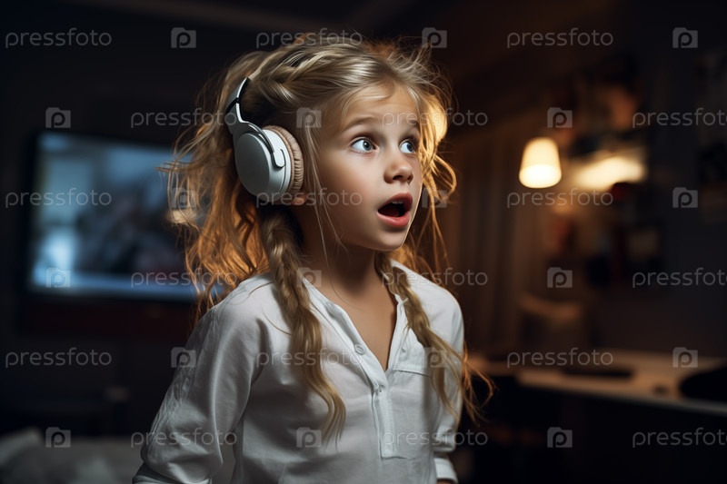 Маленькая девочка слушает музыку в наушниках вечером в гостиной