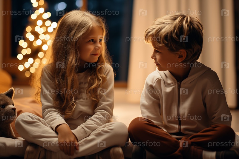 Маленький мальчик и девочка сидят на диване и общаются на праздничном новогоднем фоне