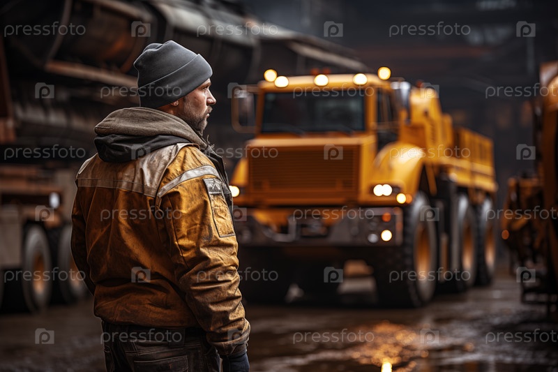 Водитель-мужчина на фоне размытой тяжелой техники