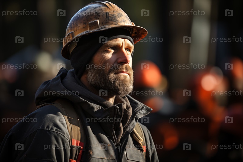 Портрет рабочего мужчины в каске на размытом промышленном фоне