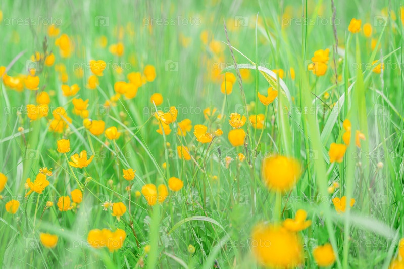 Желтые цветы среди зелени на лугу селективный фокус размытый фон