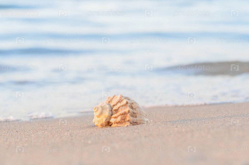 Красивая ракушка лежит на пляже, рядом с лазурной водой моря