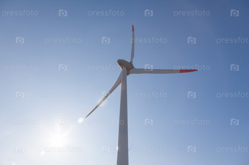 Ветряная турбина с солнечными бликами на фоне голубого неба, вид снизу