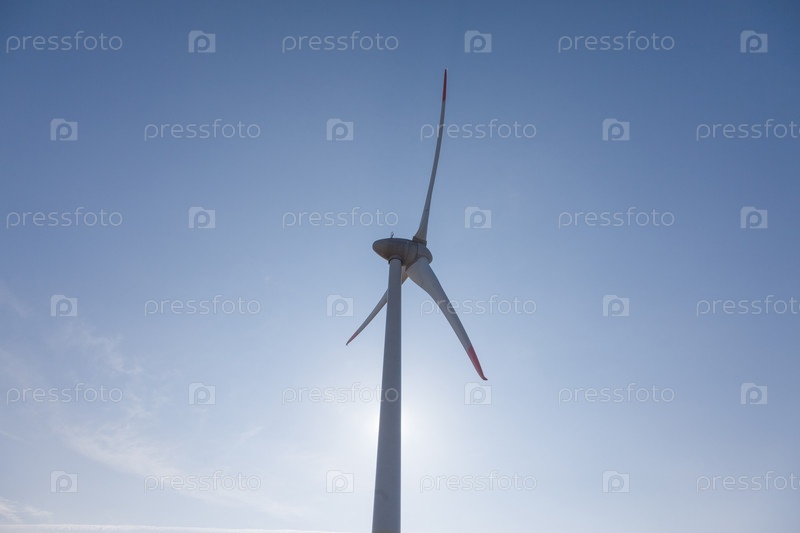 Ветряная турбина с солнечными бликами на фоне голубого неба, вид снизу