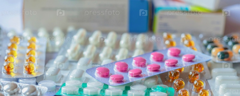 Куча разных медицинских таблеток и капсул, размытый фон