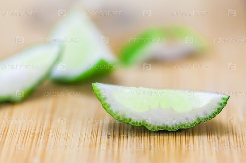 Ломтики лайма на деревянном столе, крупный план размытого фона