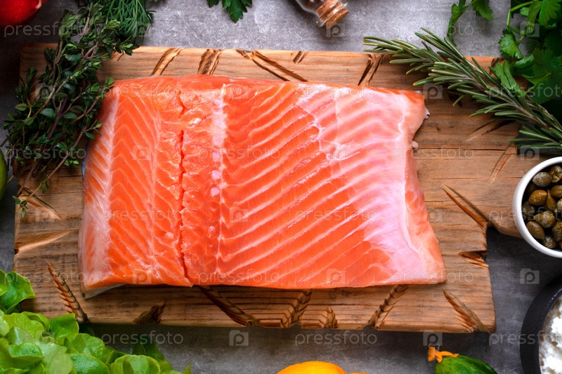 Филе соленой форели на деревянной доске в окружении ингредиентов для приготовления закуски. Вид сверху. Здоровое питание
