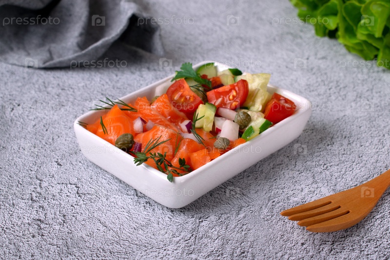 Салат из филе соленой форели и свежих овощей на керамической тарелке на сером фоне