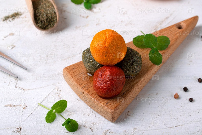 Сырные шарики из йогурта Labneh в специях подаются на небольшой деревянной доске на белом фоне блюдо ближневосточной кухни крупный план