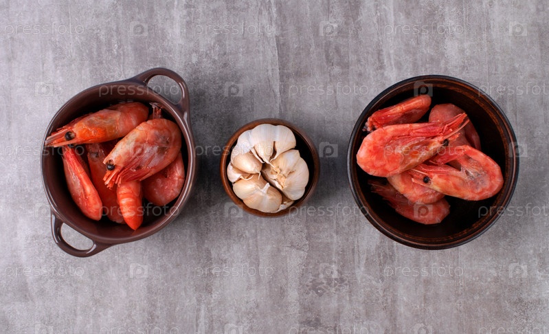 Вареные замороженные креветки в панцирях и чеснок в маленьких керамических мисках на сером фоне. Ингредиенты для приготовления. Вид сверху