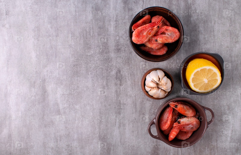 Вареные замороженные креветки в панцирях, чеснок и лимон в маленьких керамических мисках на сером фоне. Копировать пространство. Ингредиенты для приготовления
