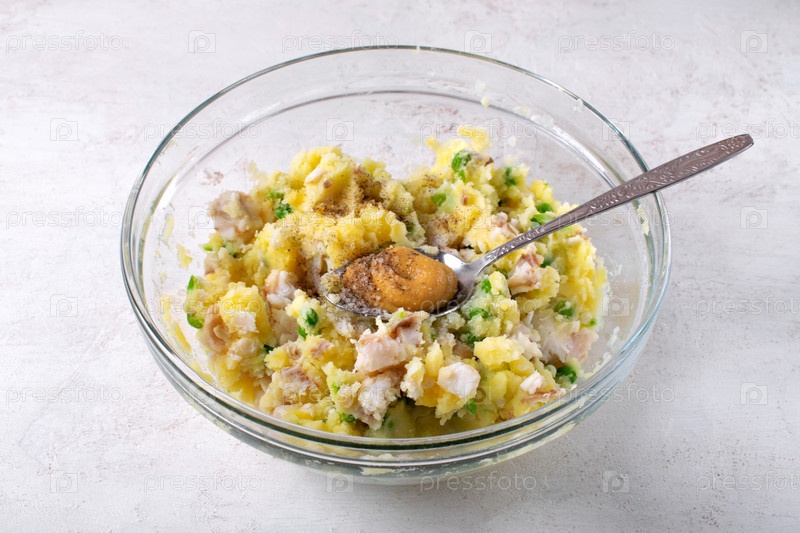 Филе белой рыбы, картофель и зеленый горошек пюрировать в стеклянной миске. Добавить горчицу и специи. Приготовить основу для котлет. Шаг за шагом