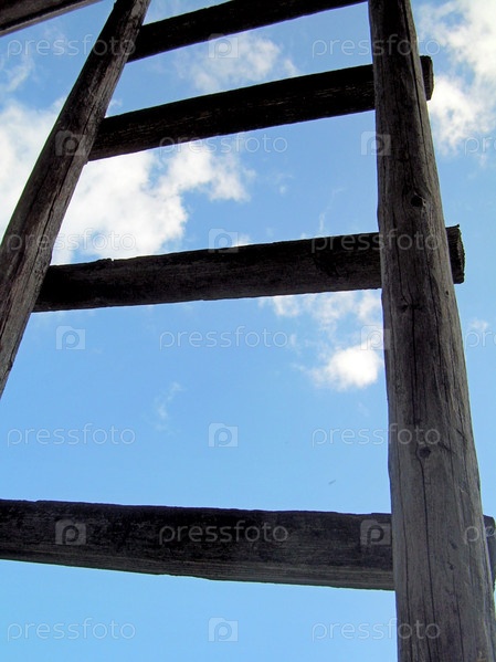 Голубое небо, просвечивает сквозь старую лестницу, небосвод, белые облака