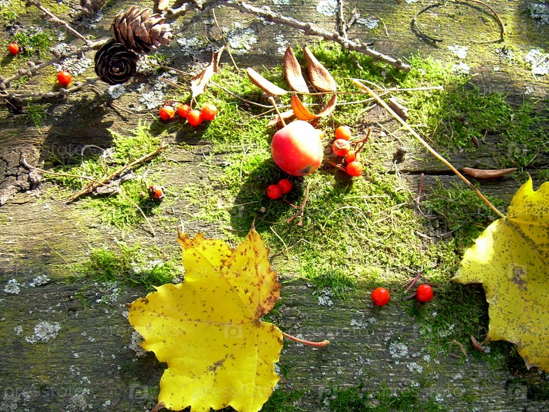 Красное яблочко, кленовые листья, шишки