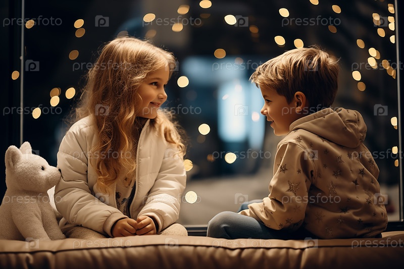 Маленький мальчик и девочка сидят на диване и общаются на праздничном новогоднем фоне