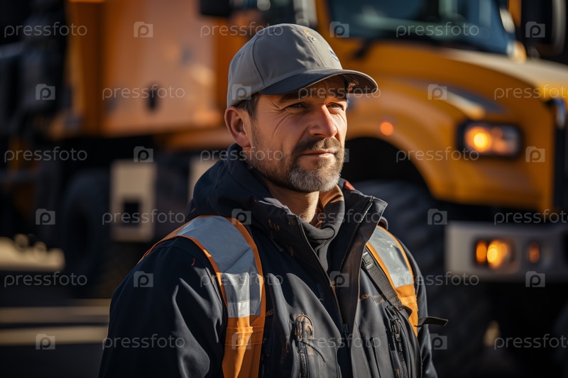Водитель-мужчина на фоне размытого тяжелого грузовика