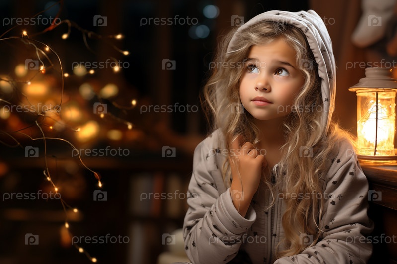 Портрет маленькой девочки в гостиной вечером, ожидающей чуда