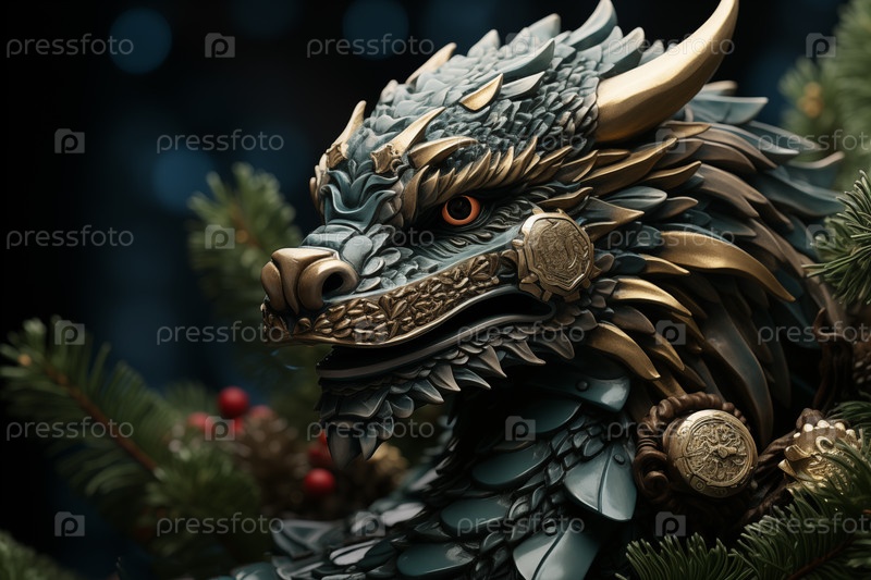 Крупный план головы зеленого дракона на ветках рождественской елки
