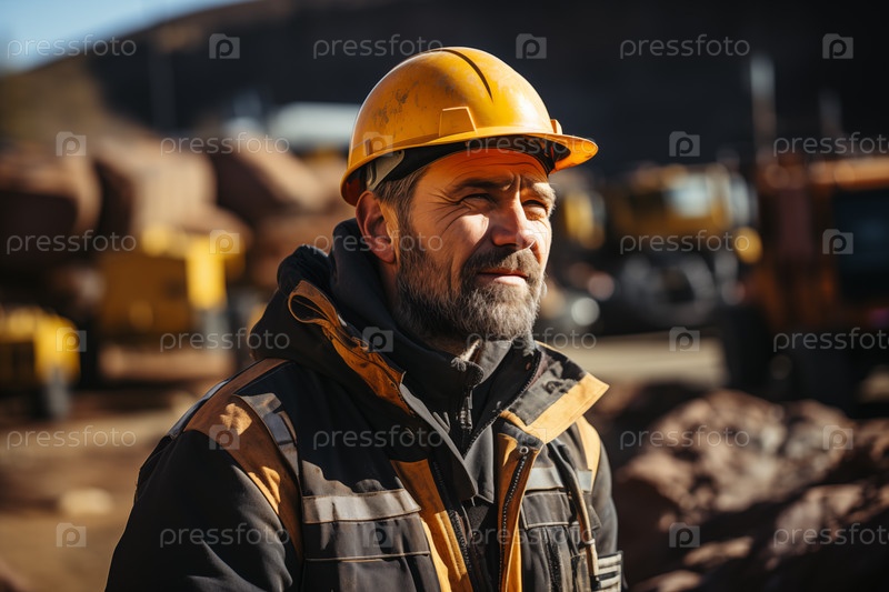 Портрет рабочего мужчины в каске на размытом промышленном фоне
