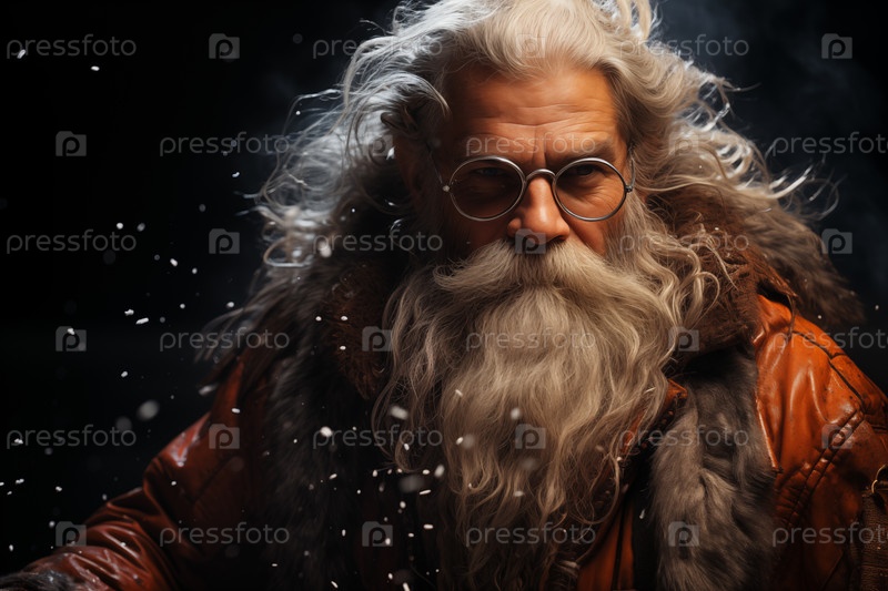 Портрет пожилого мужчины с длинными седыми волосами и бородой в красной куртке и очках на темном зимнем фоне