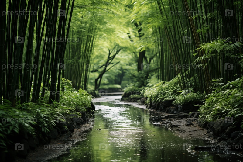 Пейзаж бамбуковой рощи со спокойной рекой
