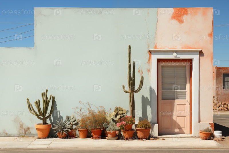 Кактусы и кактусы в горшках перед синей стеной на открытом воздухе