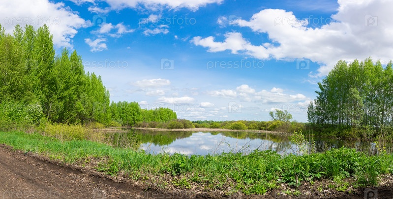 Яркий летний панорамный пейзаж с красивым прудом и зелеными деревьями в солнечный день