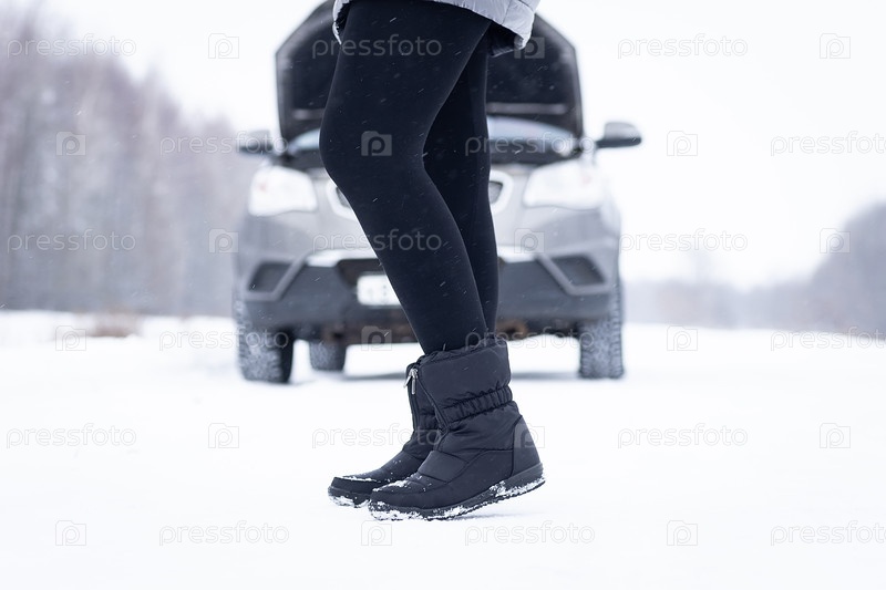 У девушек проблемы со сломанной машиной в снежный день