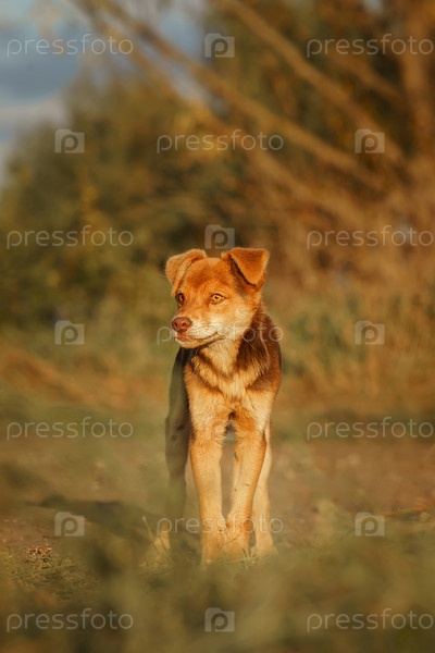 Милый и внимательный рыжий щенок в сочной зеленой траве