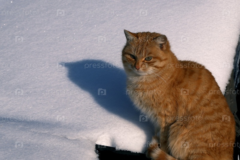 Рыжий кот на фоне свежевыпавшего снега. Солнечный день
