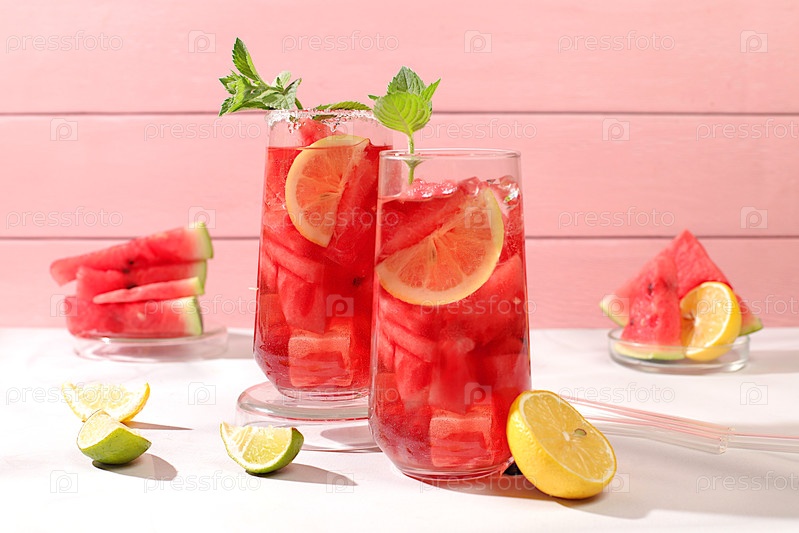 Рецепт освежающего летнего напиткаХолодный домашний лимонад или коктейль с мятой, арбузом и фруктами на солнечном столе, концепция детокс-диеты и снижения веса, меню ресторана, избирательный подход