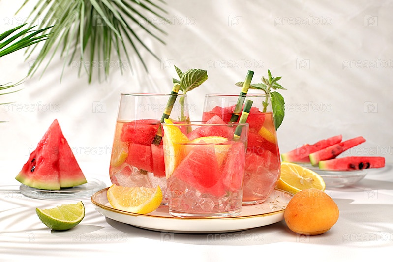 Детокс-диета и концепция летней вечеринки. Холодный домашний лимонад или коктейль с мятой, арбузом и фруктами на солнечном столе, рецепт освежающего летнего напитка, меню ресторана, селективный подход