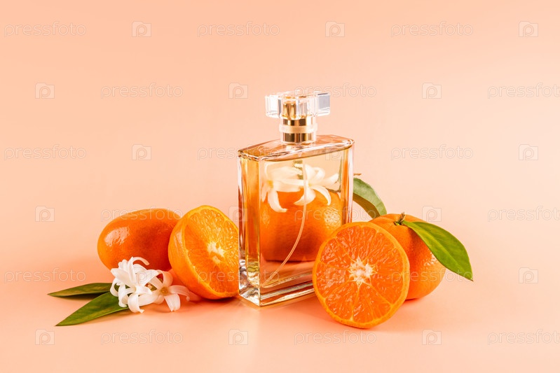 Шикарный флакон с хрустальным колпачком с парфюмированной водой или духами стоит среди спелых мандаринов. женская и мужская эссенция. Презентация продукта