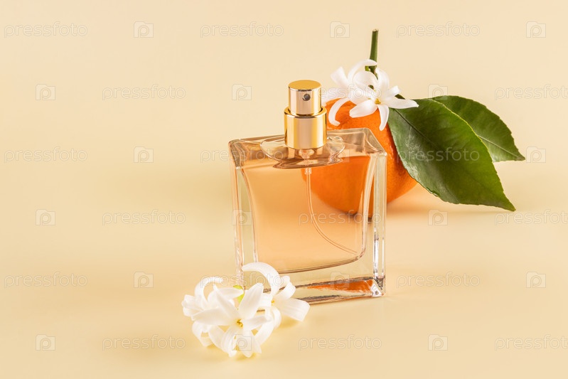 Элегантный флакон духов с ароматом цитрусовых нот на пастельном фоне. Вид спереди. Пустой макет флакона. презентационный аромат. Копировальное пространство