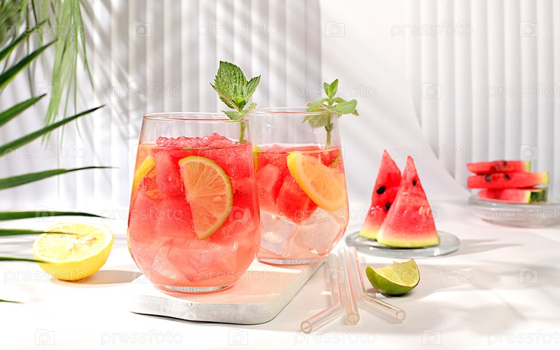 Холодный домашний лимонад или коктейль с мятой, арбузом и фруктами на солнечном столе, рецепт освежающего летнего напитка, концепция детокс-диеты и снижения веса, меню для ресторана, выборочный фокус