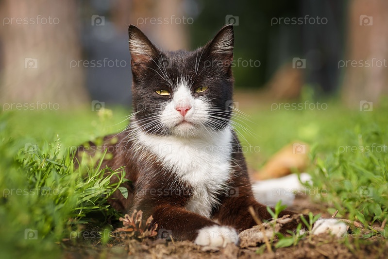 Молодой бело-черный кот гуляет в зеленом летнем саду