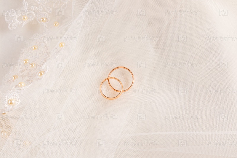 Два золотых обручальных кольца на фоне бежевой фаты с жемчужной вышивкой и бежевого атласа. Мягкие складки фаты невесты. Концепция свадьбы