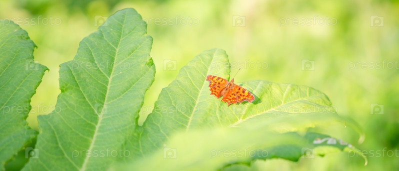Большая оранжевая бабочка на зеленом листе под летним солнцем