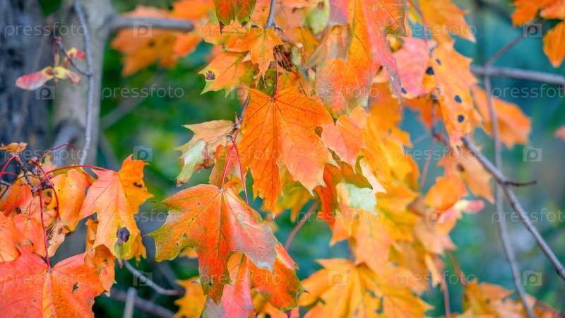 Желтые осенние листья на ветках деревьев