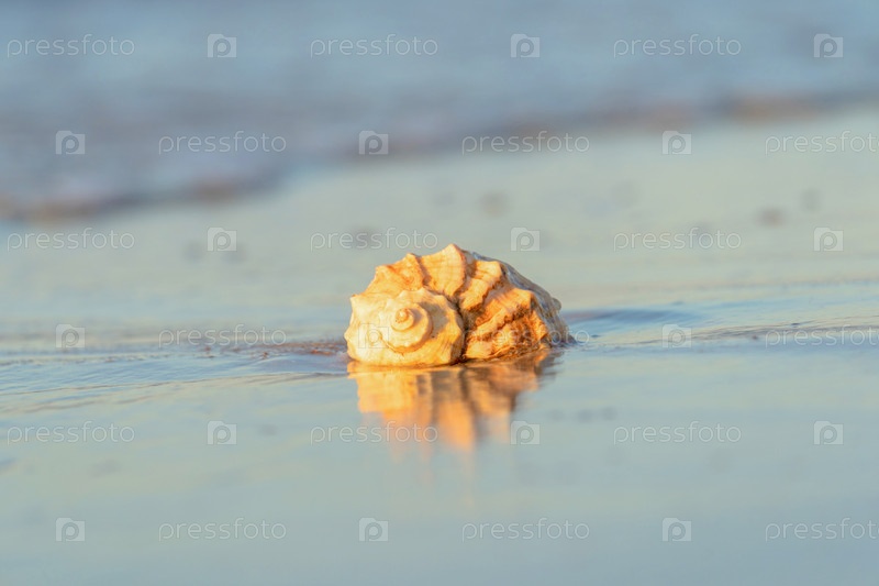 Красивая ракушка лежит на пляже, рядом с лазурной водой моря