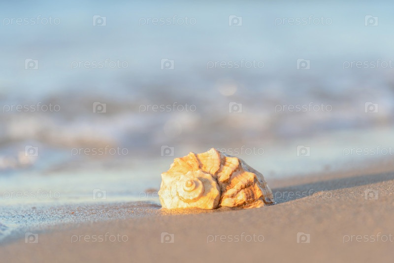 Красивая ракушка лежит на пляже, рядом с лазурной водой моря