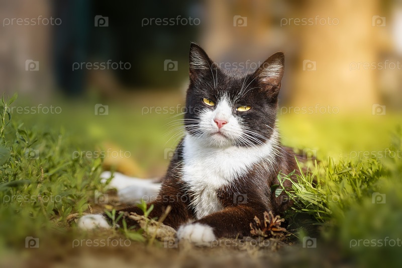Молодой бело-черный кот гуляет в зеленом летнем саду