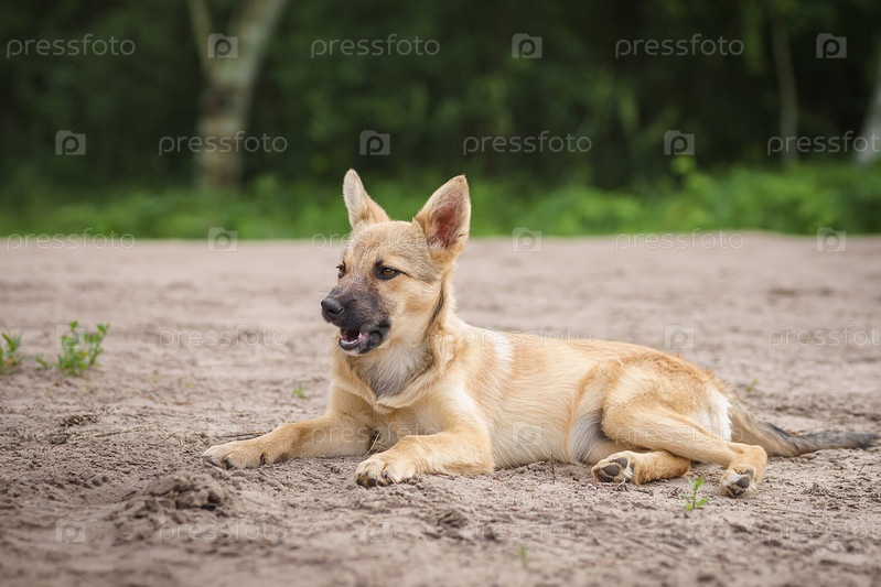 Дворняга рыжего окраса лежит на животе на траве, вытянув передние лапы вперед. Весна