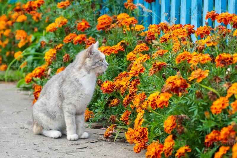 Серый полосатый кот гуляет на поводке по зеленой траве на улице