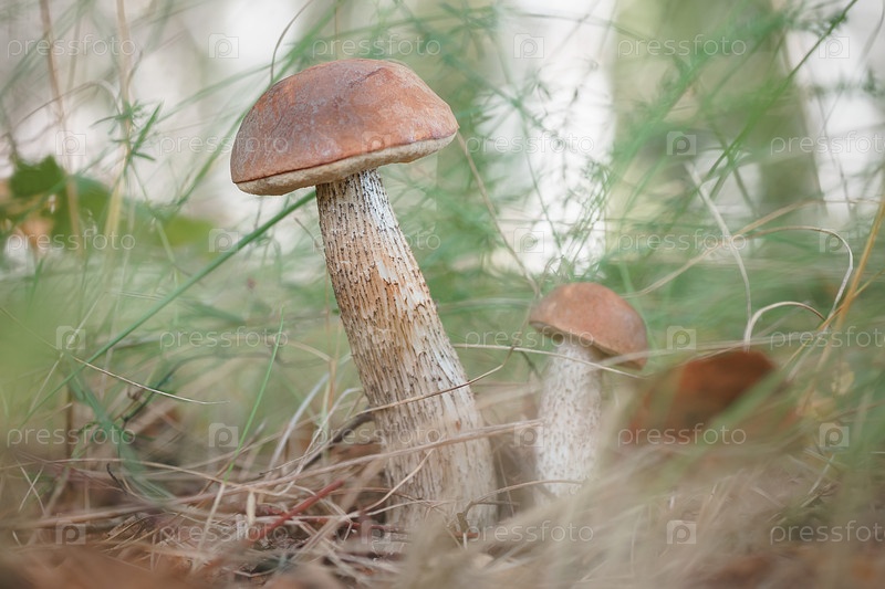 Красивый березовый гриб (подберезовик, боровик или подберезовик) в траве с осенними листьями