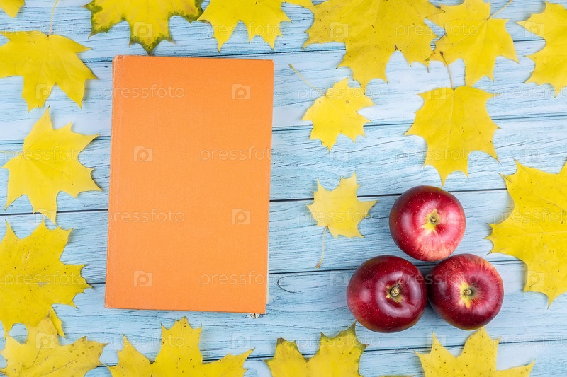 Красные яблоки и старая книга с кленовыми листьями