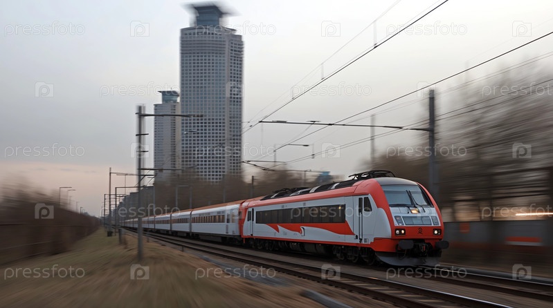 Скоростной поезд в движении рядом с современным городским пейзажем