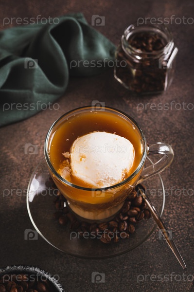 Кофе эспрессо Аффогато с ванильным мороженым в чашке на столе вертикальный вид