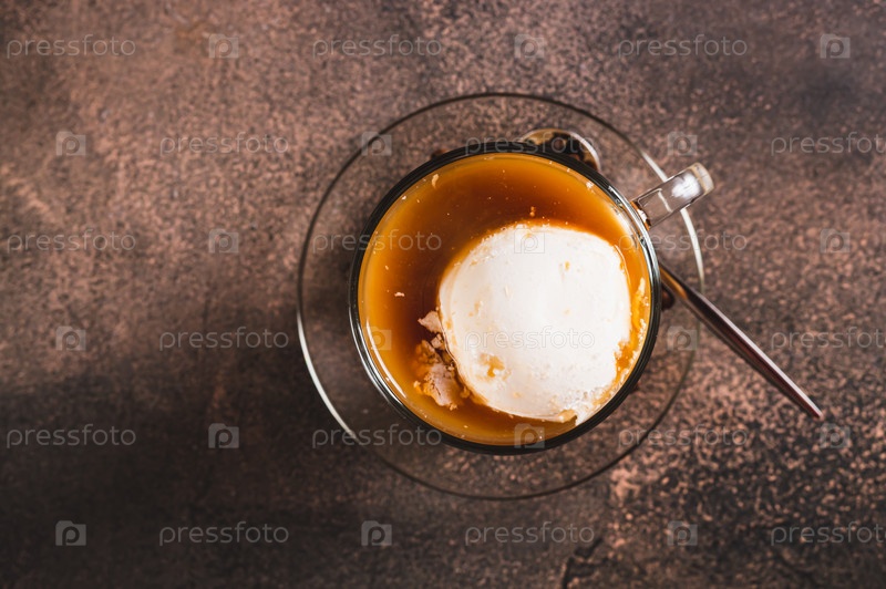 Крупный план вкусного сладкого кофе аффогато со сливочным мороженым в чашке на столешнице